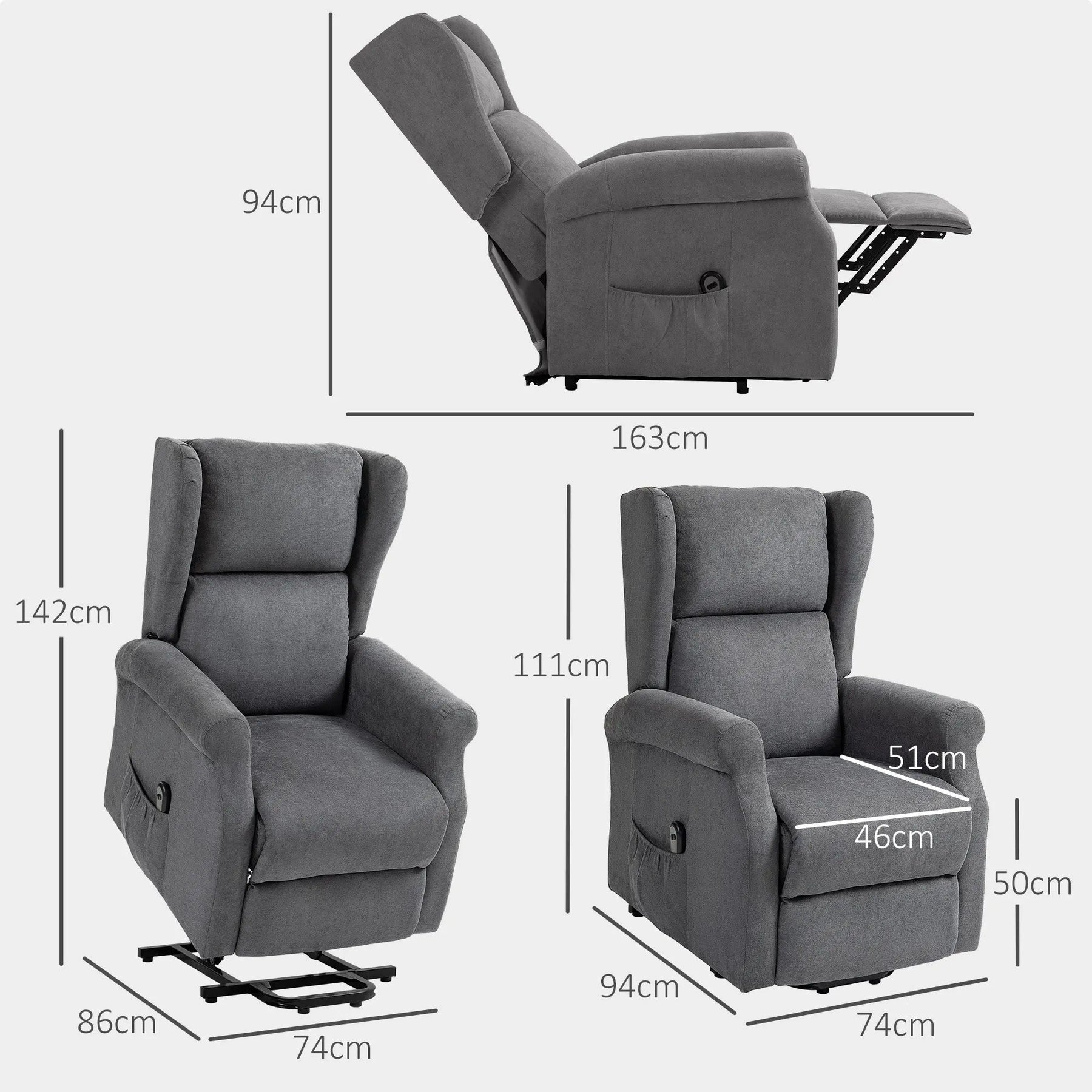 Geliefert wird der Aufstehsessel Lumaro mit passender Fernbedienung. Die Abmessungen betragen etwa 72,5 cm in der Breite, 94 cm in der Tiefe und 109 cm in der Höhe. Die Sitzfläche ist komfortabel proportioniert, sodass Sie bequem Platz nehmen und die Funktionen entspannt steuern können.