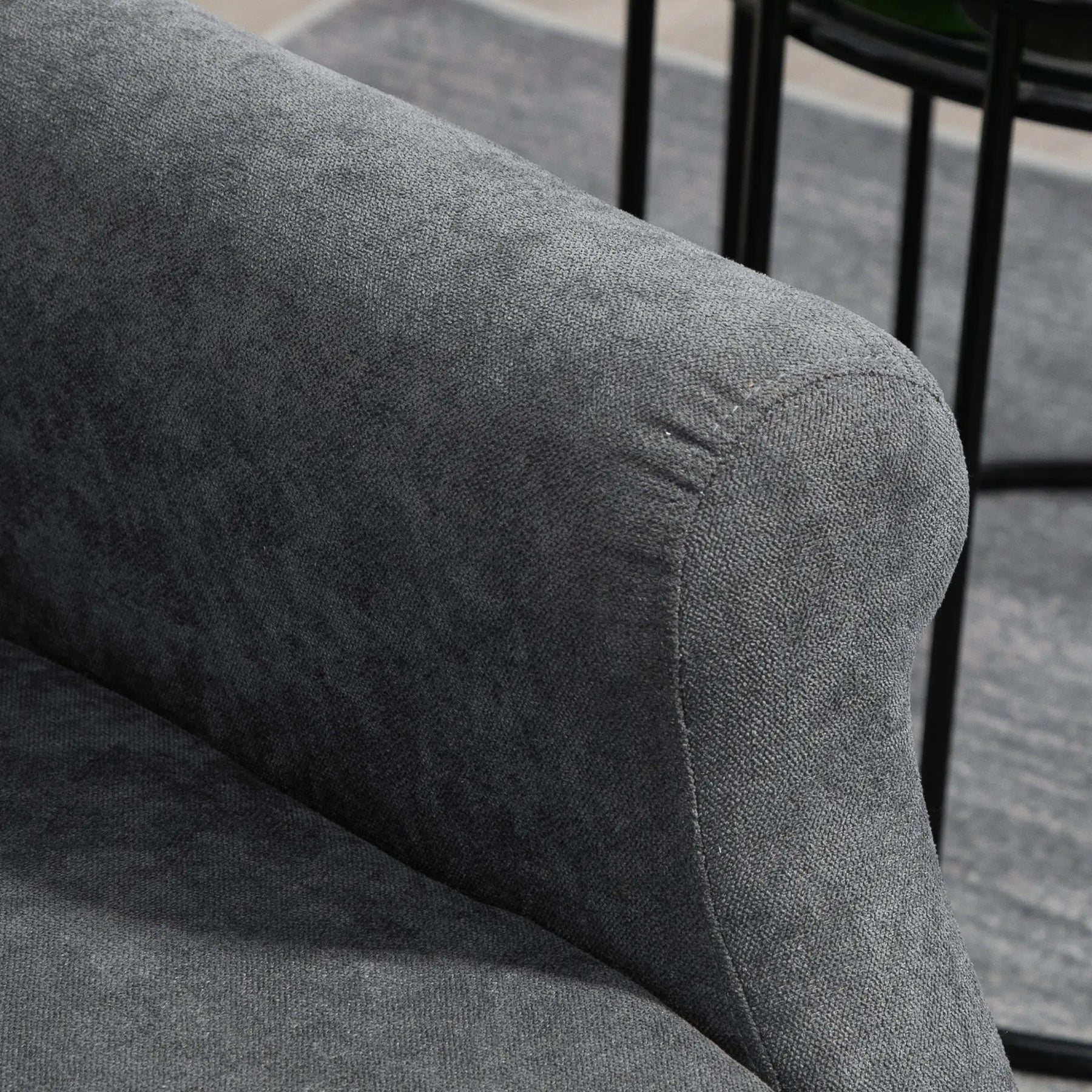Die stoffbezogene Oberfläche in Dunkelgrau vermittelt eine moderne, wohnliche Anmutung und fühlt sich angenehm an. Weiche Polsterzonen an Sitz, Rücken und Armlehnen sorgen für komfortablen Halt – ob für kurze Pausen oder längere TV-Abende. Das tragfähige Untergestell unterstützt bis zu 200 kg und gibt dem Sessel eine solide Standfestigkeit.